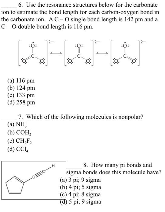 Carbonate ion bond length. Carbonates are readily decomposed by acids. But it has been found that all the three bonds are of the same length and this observation is attributed to the resonance effect. In acetylene HCCH the carbon-carbon bond order is also 3 and the CH bond order is 1.